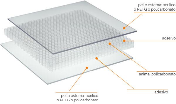 מחיצה מורכבת שכבות אולטרה קליל, במחיצה זו נעשה שילוב בין שכבות כוורת בלב הלוח, עשויות פוליקרבונט יצוק, עם שכבות חיצוניות עשויות פוליקרבונט שקוף, PETG, או ציפוי אקרילי במגוון רחב של צבעים אפשריים. מבנה המחיצה הספציפית, יוצר ניראות שקופה חלקית, המשתנה עם זוית המבט. כשהשכבות החיצוניות לשכבת ליבת הפאנל, מאפשרות לקבוע את כמות האור שתחדור מבעד למחיצה.